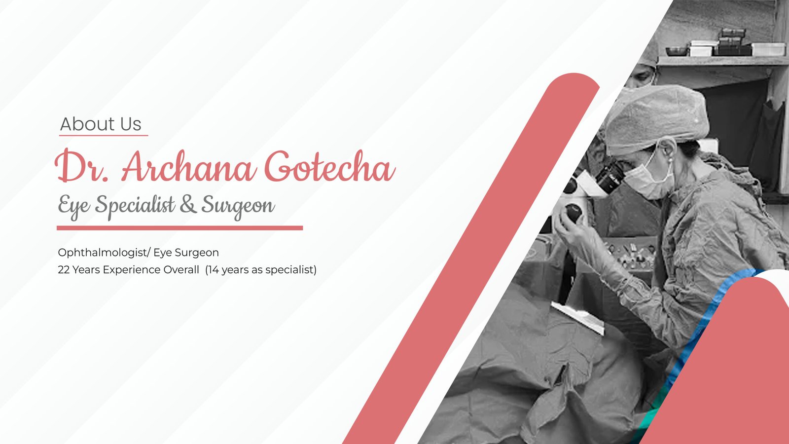A: Dr. Archana Sanghvi Gotecha has over 22 years of clinical experience in ophthalmology and eye surgery. She has been in active practice since completing her postgraduate qualifications from Maharashtra's leading medical institutions.