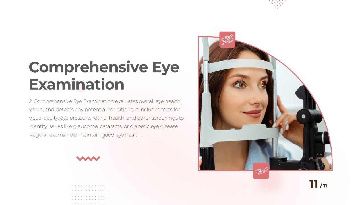 A: A comprehensive eye examination is a detailed evaluation of vision and eye health. It includes multiple tests — visual acuity, refraction, intraocular pressure measurement, dilated retinal examination, and more — to detect any eye conditions, whether or not symptoms are present. It is significantly more thorough than a basic vision screening or glasses prescription check.